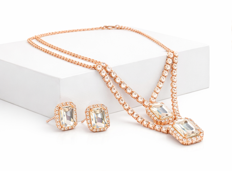 “This elegant rose-gold jewelry set is designed to add timeless beauty to your look.